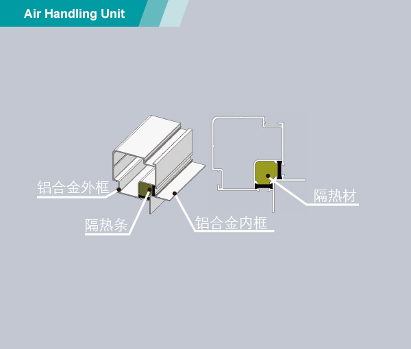 意昂2新一代MAH组合式空气处理机,艾洛斯(Aiolos)系列,采用防冷桥铝合金框架结构设计,面板与框架为压扣连接方式。